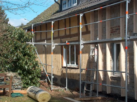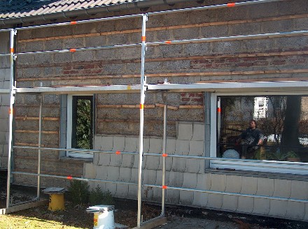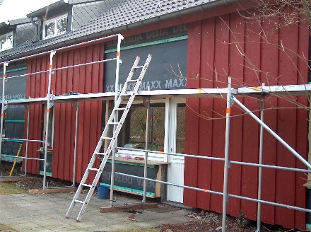Die vorhandene Fassade aus Eternit-Platten auf einer Fichte-Lattung wurde entfernt.