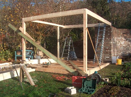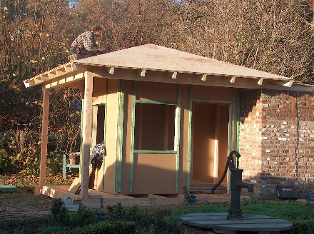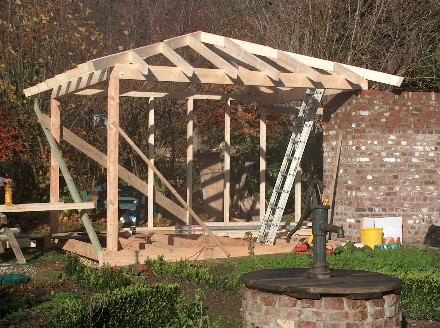 Das Gartenhaus wurde als Holzständerbau mit einem Zeltdach errichtet.