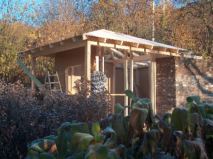 Wand und Dach bestehen aus einer 10 cm starken Balkenkonstruktion, welche von aussen mit Holzweichfaserplatten winddicht beplankt sind.